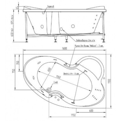 Производство Россия Гарантия 10 лет Материал Акрил Объем, л 320 Высота, см 72 Глубина, см 45 Длина, см 170 Ширина, см 110