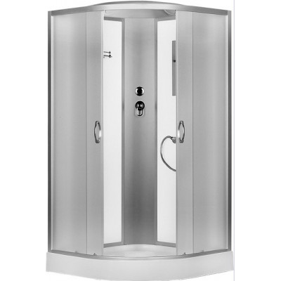 С крышей, верхний душ, зеркало, ручной душ, центральная стойка - матовый алюминий, профиль - матов. хром, дверцы -матовое стекло, задняя стенка - белое стекло, легкая сборка, полукруглый низкий усиленный поддон (17 см)