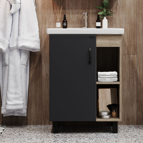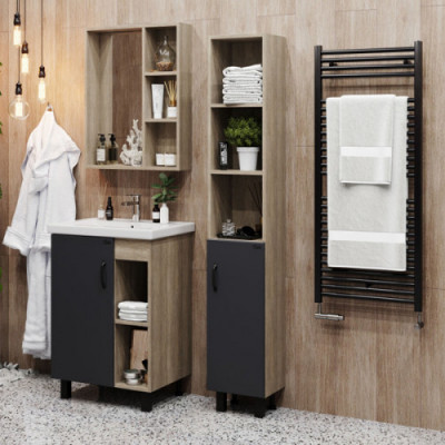 Срок поставки 10-14 дней Страна Россия Гарантия 2 года Ширина, см 61 Высота, см 69 Глубина, см 40 Тумба Onika ТИМБЕР 60. 01 серый мат. -дуб сонома с умывальником в комплекте. В тумбе Onika ТИМБЕР 60. 01 удачно сочетаются контрастные цвета и фактуры: серый матовый фасад с покрытием SoftTouch, корпус цвета дуба с роскошной текстурой, черная матовая металлическая фурнитура. Открытые полки справа обеспечивают быстрый доступ к часто используемым аксессуарам, а пространство за распашной дверцей слева, снабженной системой плавного закрывания, станет удобным местом для хранения различных бытовых принадлежностей. Корпус тумбы выполнен из ЛДСП, фасад - из МДФ в пленке, устойчивых к механическим воздействиям, перепадам температур и высокой влажности. Черная металлическая ручка и 4 ножки (2 декоративных черных и 2 пластиковых) идут в комплекте с тумбой.