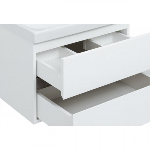 И еще одно важное преимущество: функциональная зона хранения в тумбе шириной 60 см. Она распределена между двумя выдвижными ящиками. Их внутренняя часть выполнена в белом цвете. Верхний ящик – это органайзер, разделенный на три отделения, где удобно хранить мелочи. Нижний более глубокий и позволит сложить полотенца или поставить весь арсенал пеномоющих или гигиенических средств. Ящики оборудованы доводчиками производства германской компании Hettich.