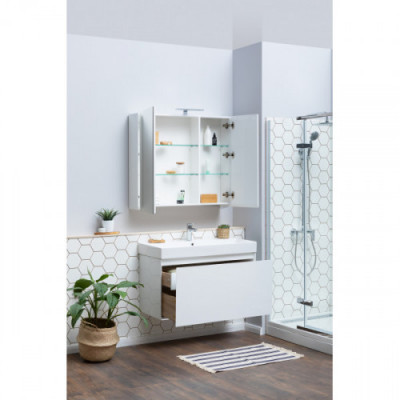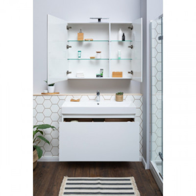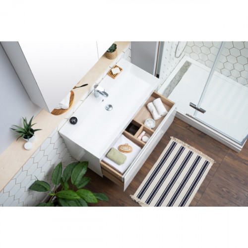 Высота, мм 622 Ширина, мм 982 Глубина, мм 436 Установка Подвесная Ориентация Универсальная Тип устанавливаемой раковины Конструкция дверей Выдвижные Материал корпуса Влагостойкий ЛДСП Материал фасада МДФ Материал раковины Керамика Покрытие Краска/глянец Цвет Белый Тумба с раковиной Aquanet Йорк 100 кажется довольно-таки простой внешне, но за видимой простотой кроется тщательная работа над каждой линией, над каждой деталью. Обратите внимание на интегрированную ручку, которой по сути не видно, но при открывании выдвижного ящика она поражает удобством использования. Радует глаз зеркальная чистота глянцевой поверхности фасада из МДФ. Мебель белоснежная. Цветовой акцент появляется при выдвижении ящика тумбы, так как внутренние детали сделаны в цвете «дуб сонома». Сочетание выглядит благородно и эстетично, при этом не изменяя общей идее лаконичности во всем. Ящик в тумбочке один, но внутри него прячется еще одна зона хранения, в которой можно разложить по местам разнообразные мелочи. В системе выдвижения использована фурнитура немецкого производителя Hettich. Тумба шириной 100 см комплектуется керамической раковиной Sanovit. Она может быть как подвесной, так и напольной – на выбор покупателя.