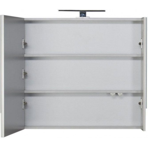Широкая форма зеркала удобна при использовании вдвоем, а вместительный шкаф позволит держать все необходимые косметические средства в идеальном порядке.