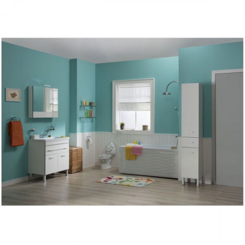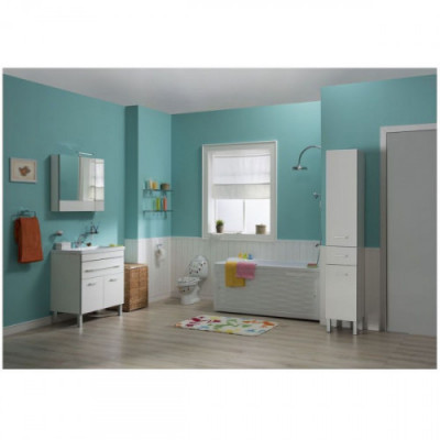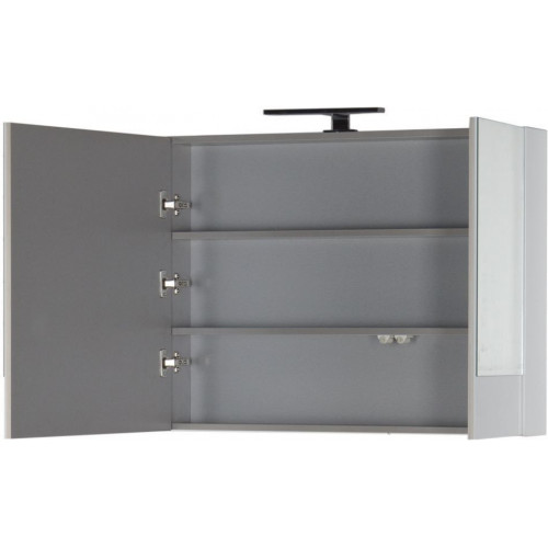 Широкая форма зеркала удобна при использовании вдвоем, а вместительный шкаф позволит держать все необходимые косметические средства в идеальном порядке.