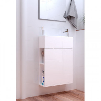 Корпус и фасады тумбы выполнены из МДФ, облицованы глянцевой ПВХ пленкой белого цвета. Минималистичный дизайн без ручек: открывание от захвата. Петли на дверце с доводчиками.