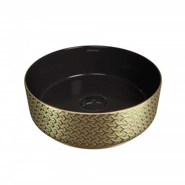 Артикул GR-5010GB Материал Фаянс Длина, см Ширина, см 35,5 Высота, см 11,5 Раковина накладная 35,5 см Grossman GR-5010GB. Материал - фаянс. Цвет - черный внутри, золотой с геометричной текстурой снаружи. Диаметр слива - 4,5 см