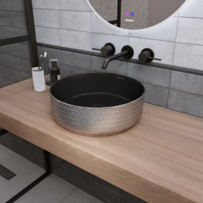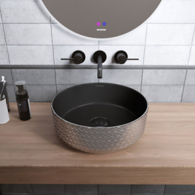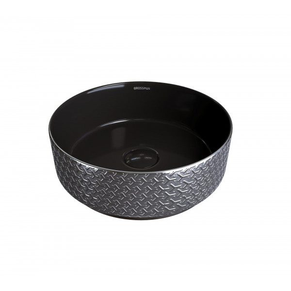 Артикул GR-5010SB Материал Фаянс Длина, см Ширина, см 35,5 Высота, см 11,5 Раковина накладная 35,5 см Grossman GR-5010SB. Материал - фаянс. Цвет - черный внутри, серебряный с геометричной текстурой снаружи. Диаметр слива - 4,5 см
