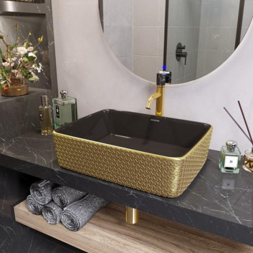 Артикул GR-3016GB Материал Фаянс Длина, см Ширина, см 48 Высота, см 13 Раковина накладная 48 см Grossman GR-3016GB. Материал - фаянс. Цвет - черный внутри, золотой с геометричной текстурой снаружи. Диаметр слива - 4,5 см