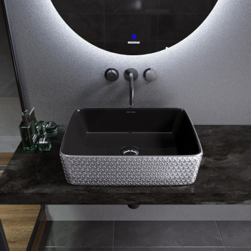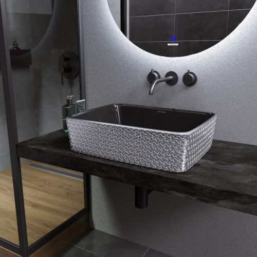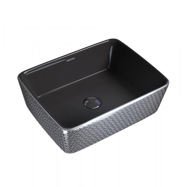 Артикул GR-3016SB Материал Фаянс Длина, см Ширина, см 48 Высота, см 13 Раковина накладная 48 см Grossman GR-3016SB. Материал - фаянс. Цвет - черный внутри, серебряный с геометричной текстурой снаружи. Диаметр слива - 4,5 см